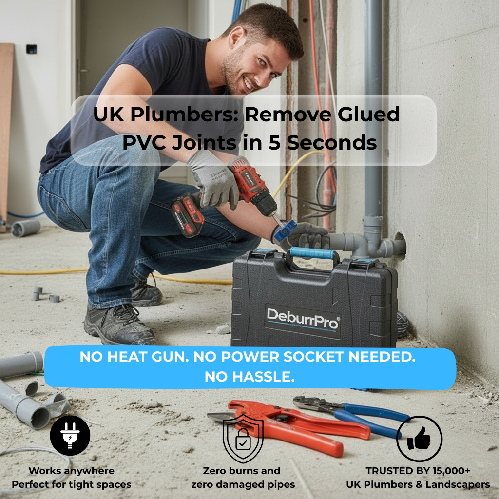 It removes glued PVC joints in seconds using any drill – no heat gun, no damaged pipes, no burns. Perfect for disconnecting waste pipes, repairing leaks, or replacing fittings fast.